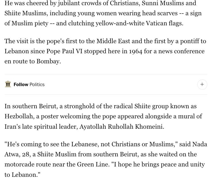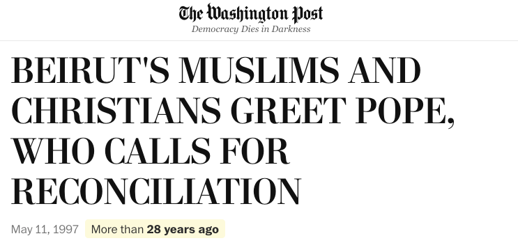 Papal visits to Lebanon have always been moments when the country pauses (briefly) to look at itself through an external moral lens. In a region where political positions are often treated as existential identities, the Pope’s presence carries symbolic weight. It forces competing factions to recalibrate how they present themselves, both internally and to the world. If you don’t believe me, read this Washington Post piece from 28 years ago. It’s as if it was written today.